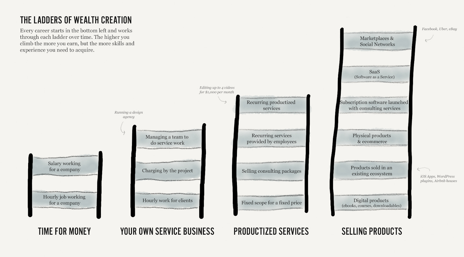 ⚙️ The ladders of wealth creation by Nathan Barry - A ladder in which, virtually, we are all in. At the bottom left, employees. At the top right, Amazon. Lots of steps, experiences and growth.